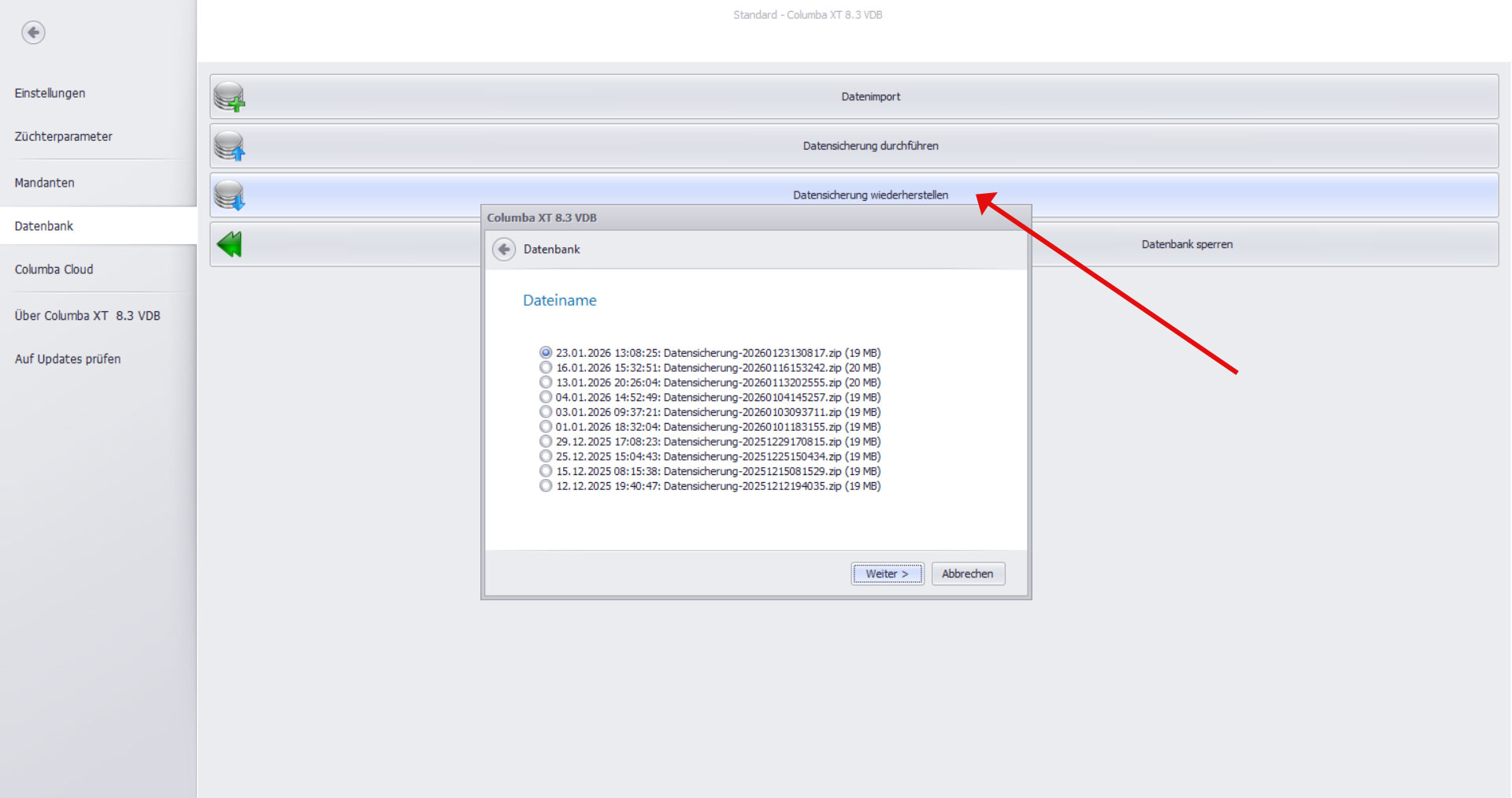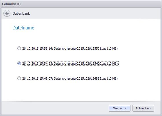 Nun werden Ihnen alle vorhandenen Sicherungen mit Datum und Dateigröße angezeigt.