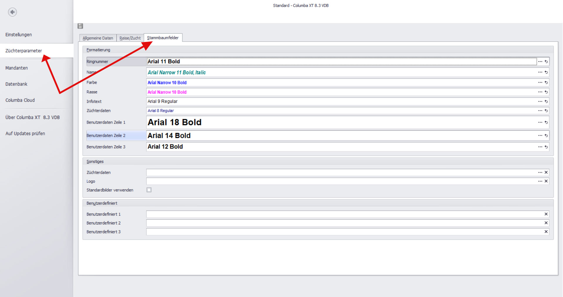 Im Züchterparameter im Tab Stammbaumfelder können Vorgaben für den Stammbaumausdruck festgelegt werden: