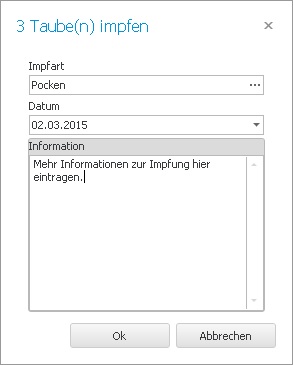 Es öffnet sich ein neues Fenster in dem Sie für alle markierten Tauben die Art der Impfung, das Impfdatum und ggf. zusätzliche Informationen eintragen können. Impfarten müssen vorher unter dem Menüpunkt Impfarten angelegt worden sein, bevor Sie hier zugewiesen werden können. Ist alles entsprechend eingetragen werden durch einen Klick auf OK die Einträge erstellt.