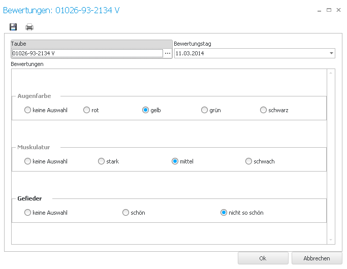 Wählen Sie die Taube aus, die Sie bewerten möchten, und treffen im unteren Bereich Ihre Auswahl für die einzelnen Kriterien.