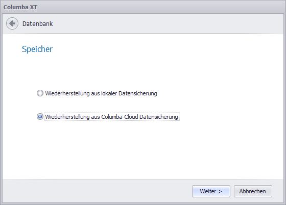 Zunächst wählen Sie, ob Sie eine lokal gespeicherte oder eine in der Cloud gespeicherte Datensicherung wiederherstellen möchten und klicken Sie auf Weiter.
