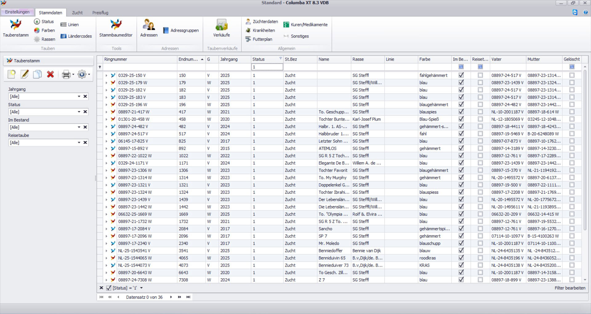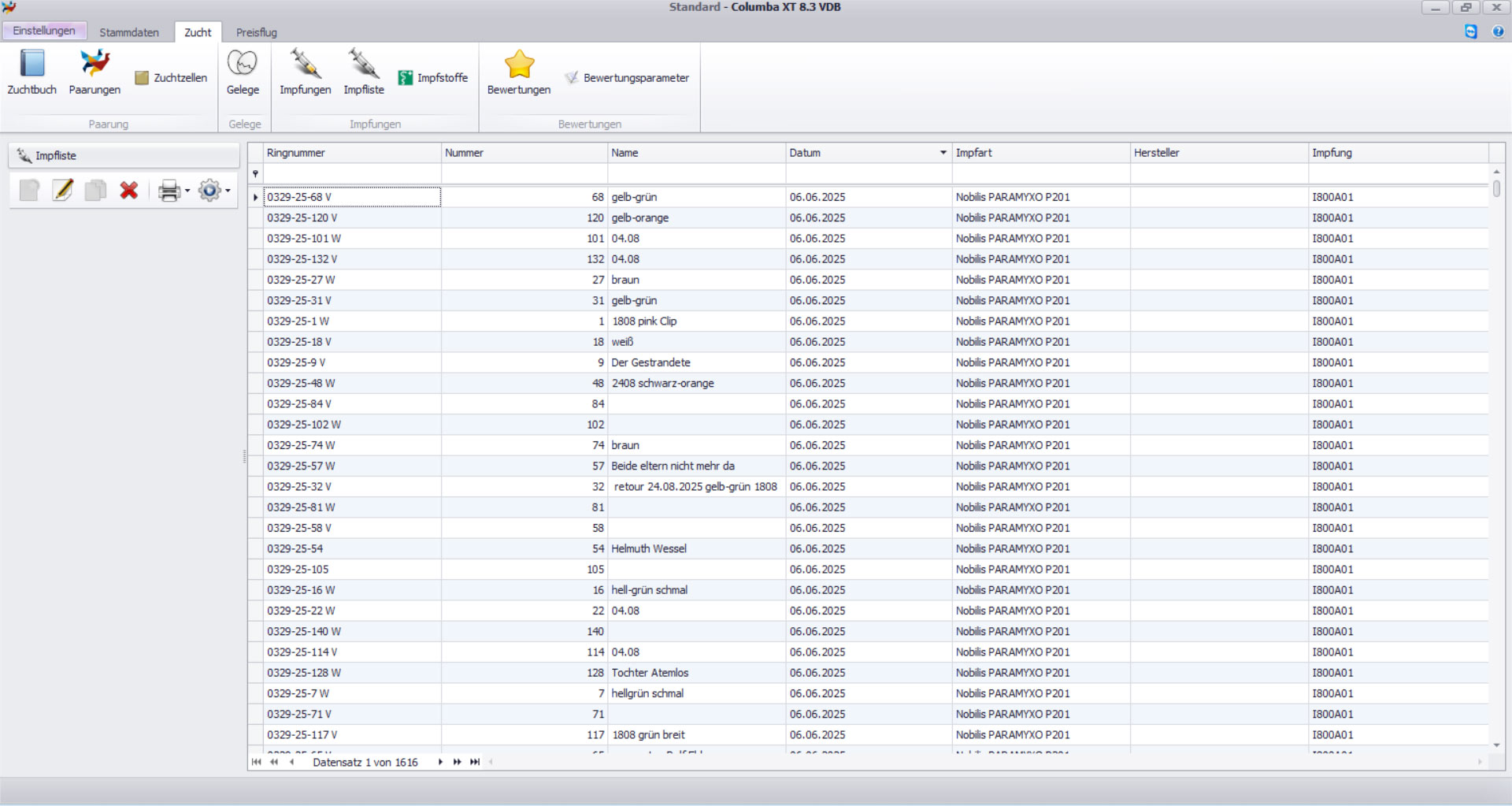 In der Übersicht Impfliste tauchen diese Tauben daraufhin mit den entsprechend eingegebenen Daten zur Impfart und Impfdatum auf. Sie können z.B. nach Ringnummer, Impfdatum oder Impfart filtern, um die für Sie relevanten Daten anzeigen und ausdrucken zu können.