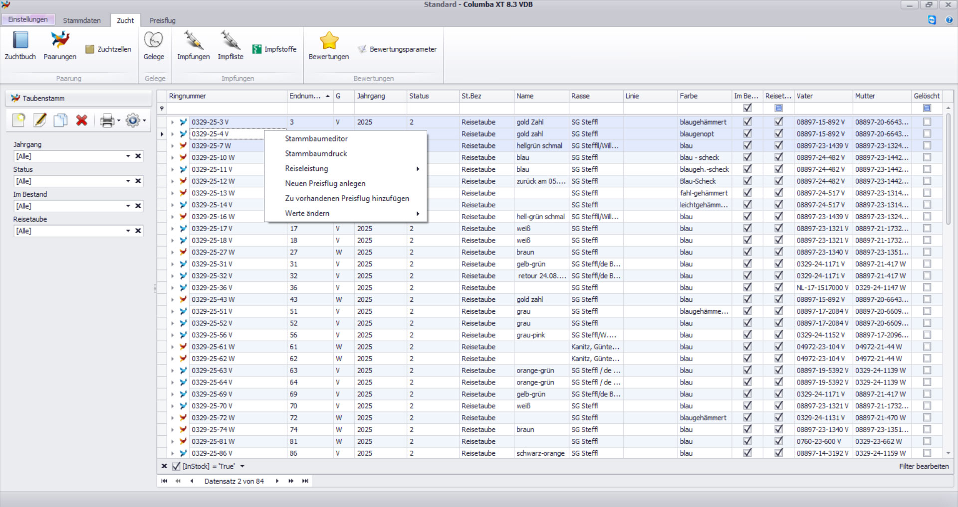 Um einzelne Tauben zu exportieren öffnen Sie zuerst den Taubenstamm im Columba XT.