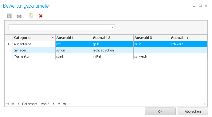 Wählen Sie die Taube aus, die Sie bewerten möchten, und treffen im unteren Bereich Ihre Auswahl für die einzelnen Kriterien.